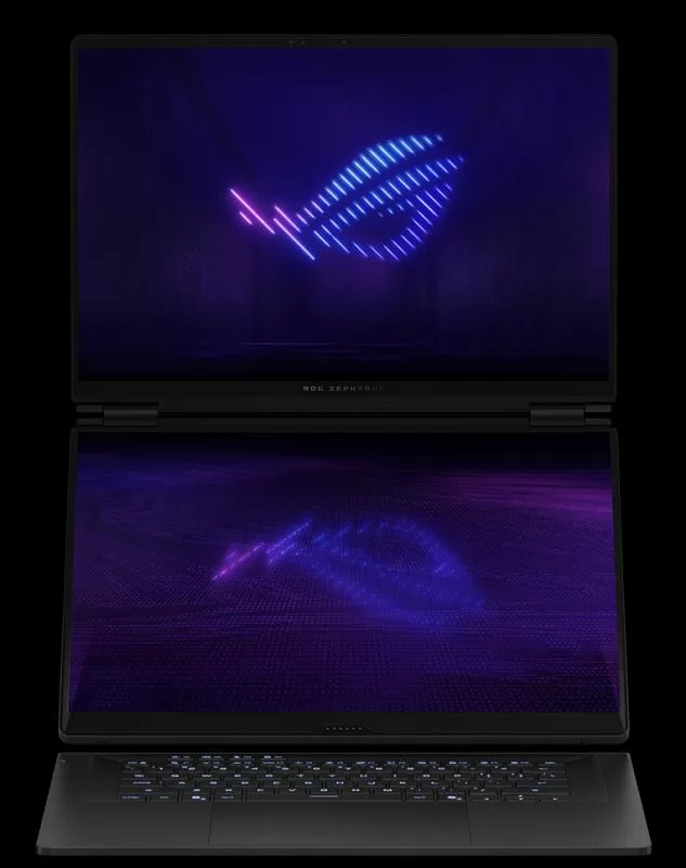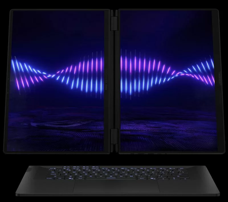 L’ordinateur intègre deux dalles de 16 pouces. Elles affichent une résolution de 2880 x 1800 pixels. Le taux de rafraîchissement est de 120 Hz et une interface tactile. Ces écrans sont certifiés VESA DisplayHDR True Black 1000, Dolby Vision et Pantone. La luminosité maximale est de 1100 nits et une couverture colorimétrique DCI-P3 complète. Le second écran est conçu pour étendre l’espace de travail et permettre le multitâche sans nécessiter de moniteur externe.