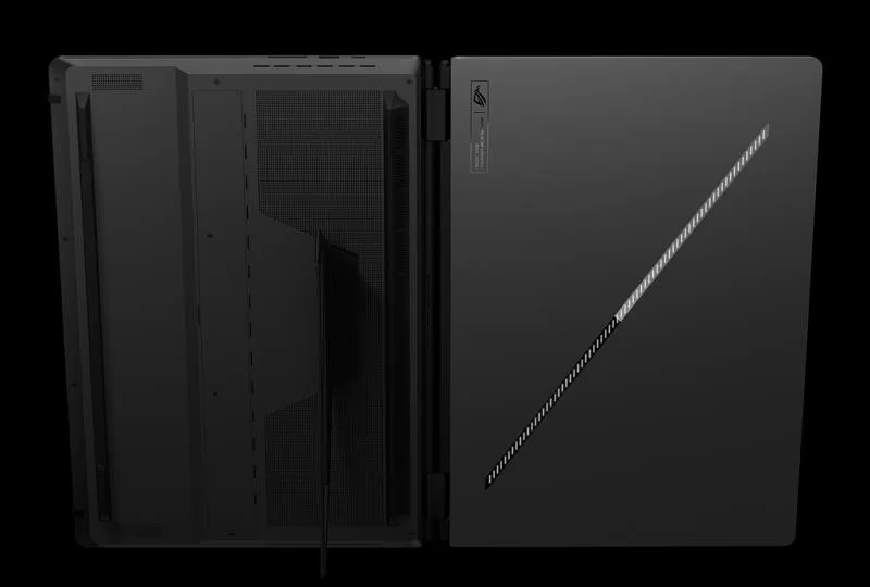 Les performances thermiques sont assurées par un système de refroidissement combinant métal liquide. Mais aussi une chambre à vapeur, deux ventilateurs et dissipateur thermique à base de graphène. Cette configuration permet au GPU de fonctionner jusqu’à 150 W en pleine charge. Une performance remarquable pour un système de cette catégorie. Le châssis, usiné CNC en alliage d’aluminium, garantit une rigidité structurelle optimale tout en intégrant la configuration à double écran.
