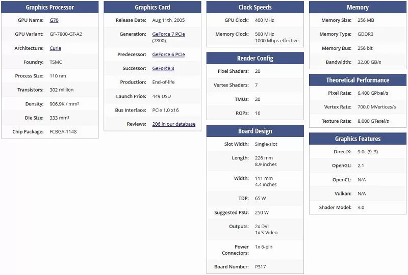 Voici la fiche technique de cette NVIDIA 7800GT :